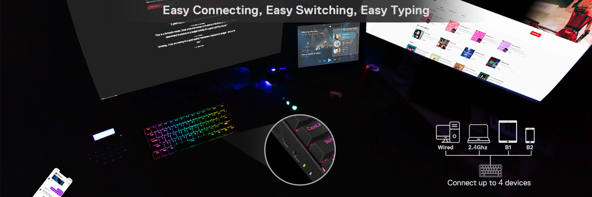 Built-in upgraded 3.0/5.0 Bluetooth and 2.4Ghz wireless chips, K530 Pro offers a real-wireless and no-latency connection for all devices. Easy to toggle among 3 different wireless devices via side switch (2.4Ghz/BT1/BT2).