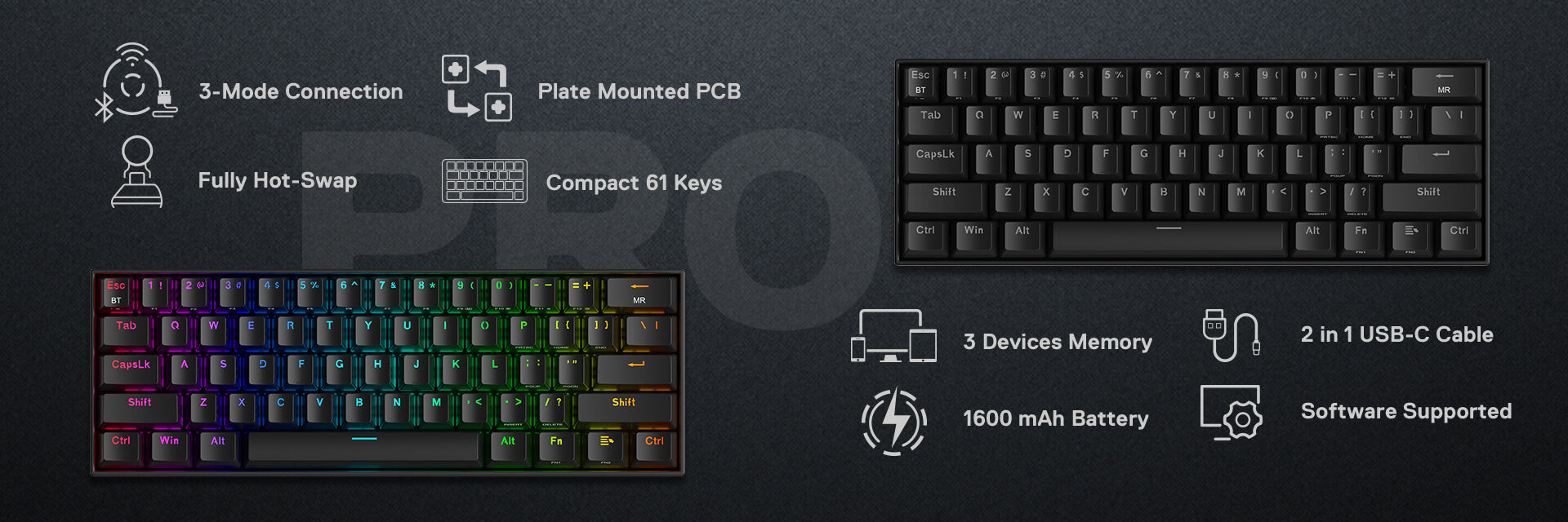 Function Upgraded YES✔, Price Increased NO✗, that is the ultimate brand-new K530 Draconic PRO. New 3 modes connection, 61 keys fully hot-swappable PCB plus original compact 60% layout. This time, you will not regret having one, the wait is over.