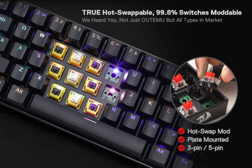 The transformative innovation with 99.8%+ switches compatible free-mod hot swappable Redragon keyboard is available now. The unique exclusive structure design of the socket makes the switch mounting easier and less wobbling.