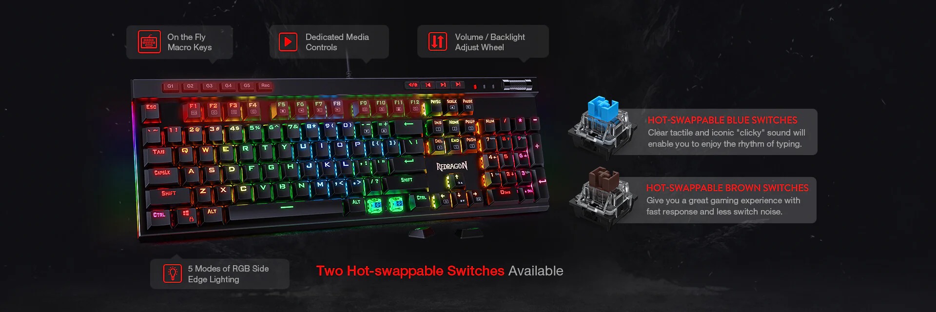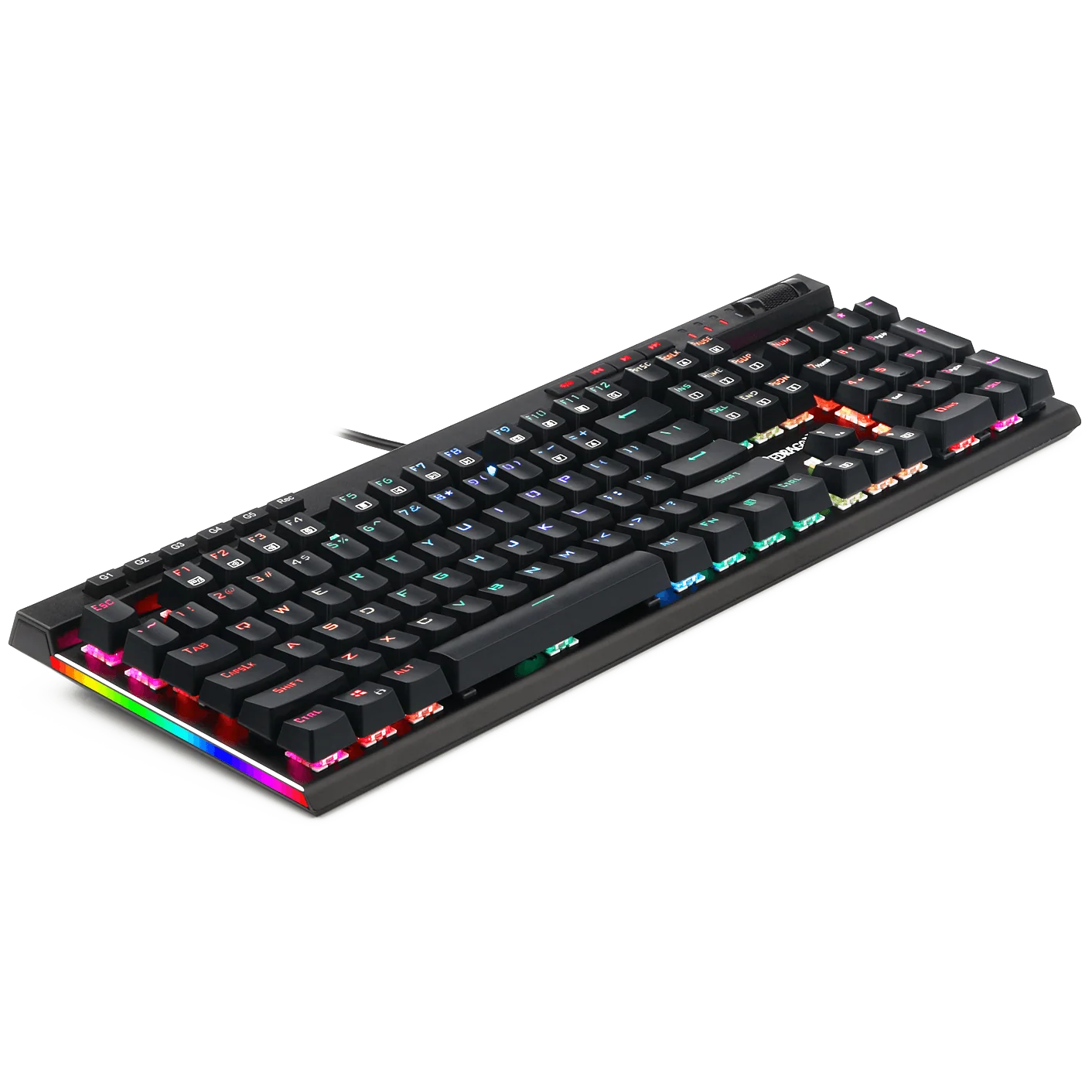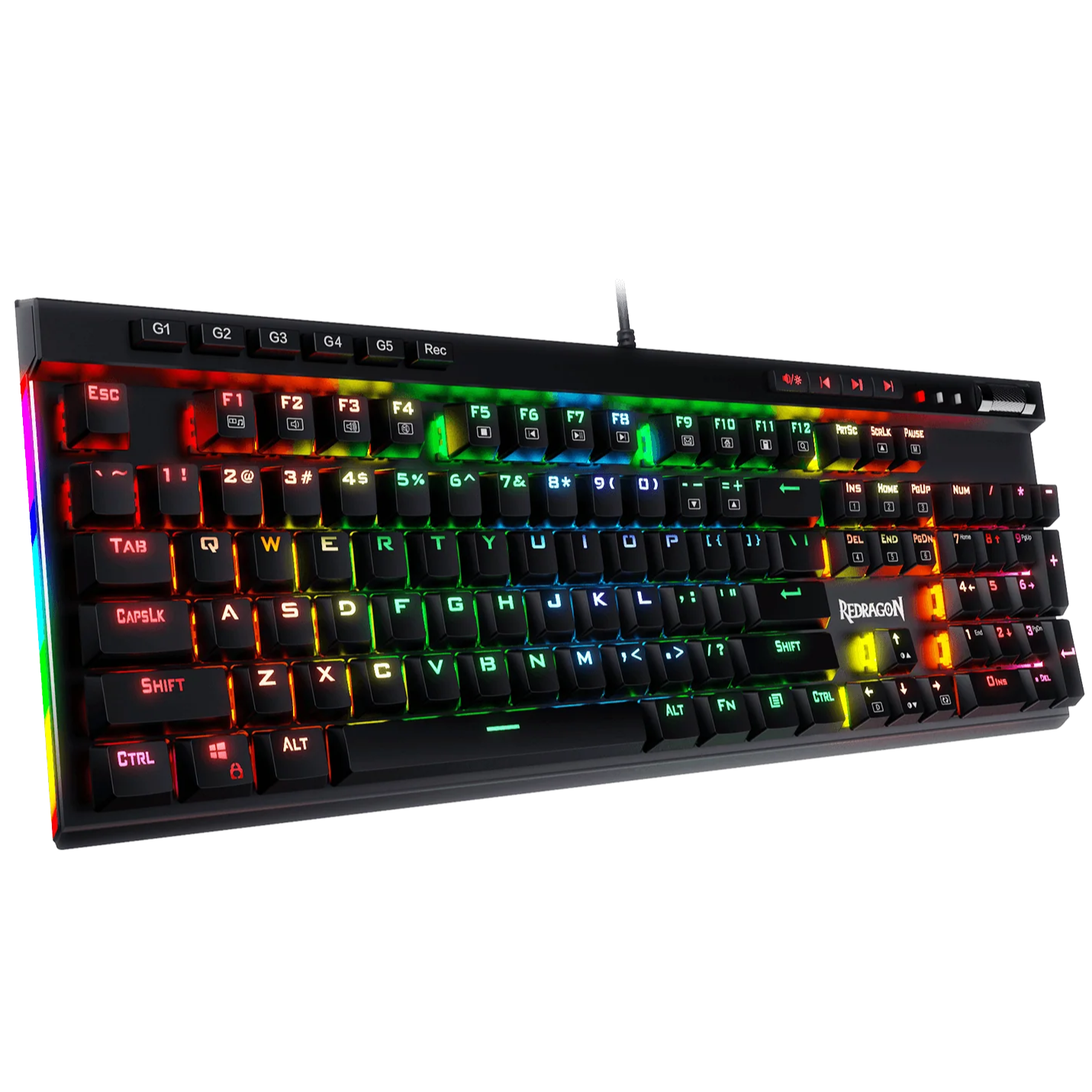Redragon K580 Vata RGB LED backlit mechanical gaming keyboard have 5 programmable macro keys (G1~G5) on the keyboard which can be recorded macros on the fly without any additional software required to be installed. Easy to edit and DIY your stylish keyboard. (No CD software included)
