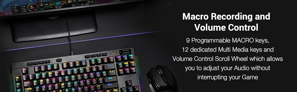 The keyboard has 12 multi-media keys, 9 programmable macro buttons, and a volume control scroll wheel so you may change the audio without interfering with your game.