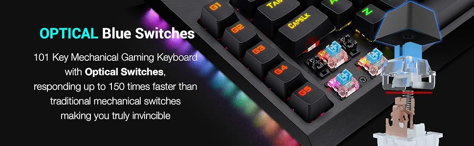 You are genuinely unbeatable with this compact gaming keyboard, which has 101 keys and optical Red switches. It responds up to 150 times faster than conventional mechanical switches. The keys provide quick, clear, and accurate tactile feedback in addition to an audible click sound. Lacking a separate gaming keyboard for numbers.