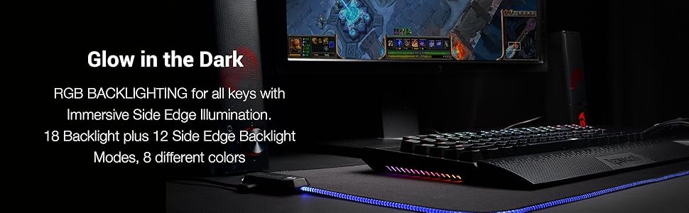 Keycaps made with double-shot injection molding provide uniform, crystal-clear illumination and non-scratch writing. Twelve side-edge backlight modes, eight distinct colors, five brightness levels, breathing speed, and user-defined backlighting are included in the 18 backlights.