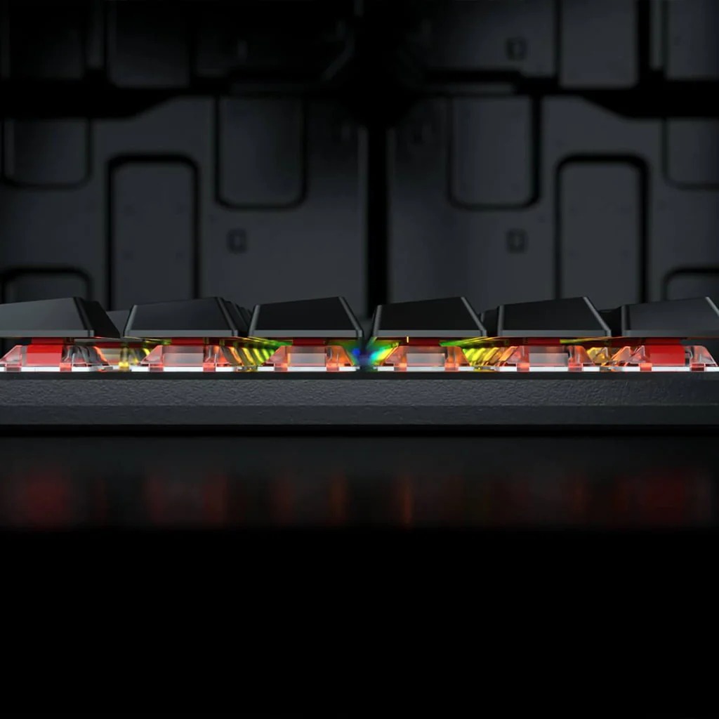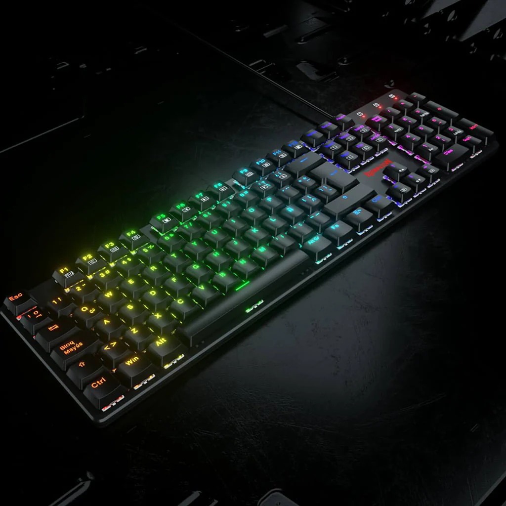 Redragon K589 Shrapnel RGB Backlit Mechanical Gaming Keyboard the latest low profile design with a 30% lower key height provides the most precision you expect from original mechanical switches, enabling you to react faster to situations and enemies in games. 1.3mm mechanical OUTEMU switches reduce the travel distance and clicky noise while keeping the same signature durability and accuracy.