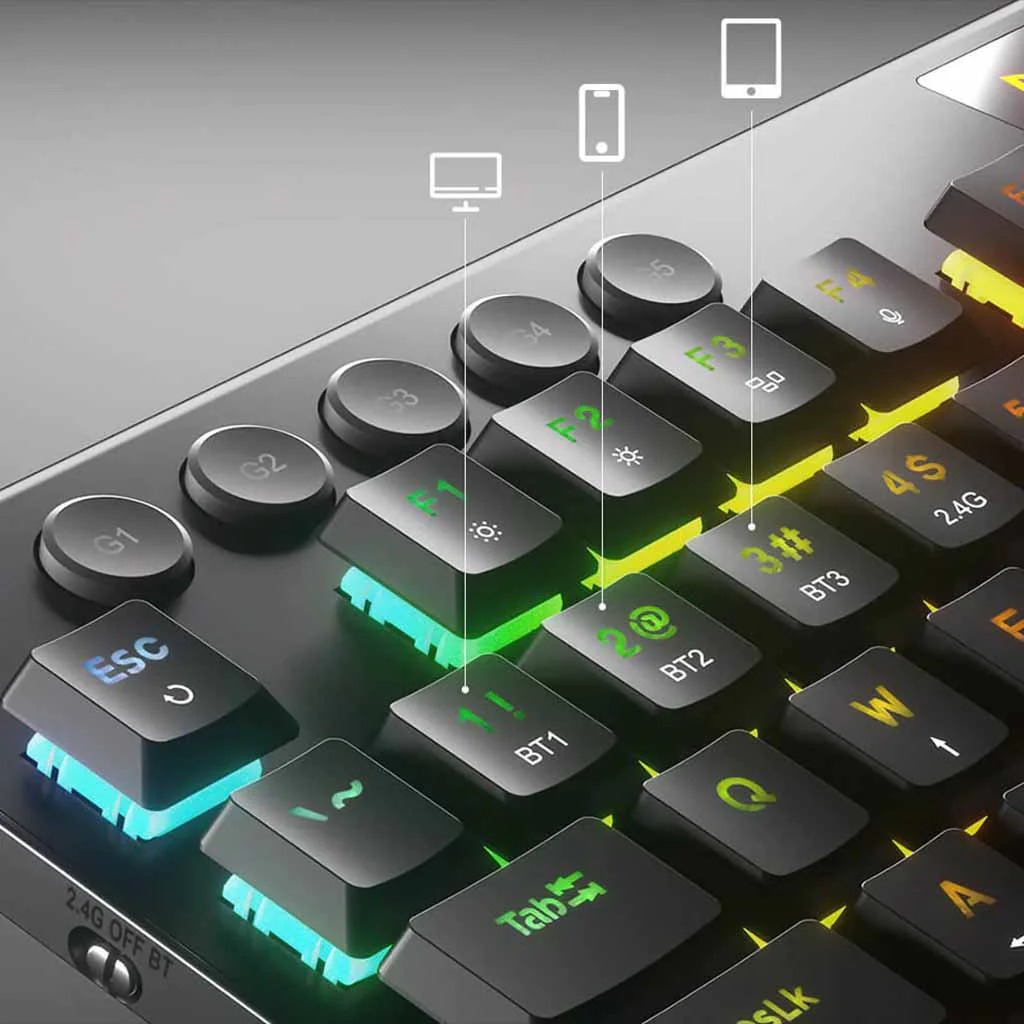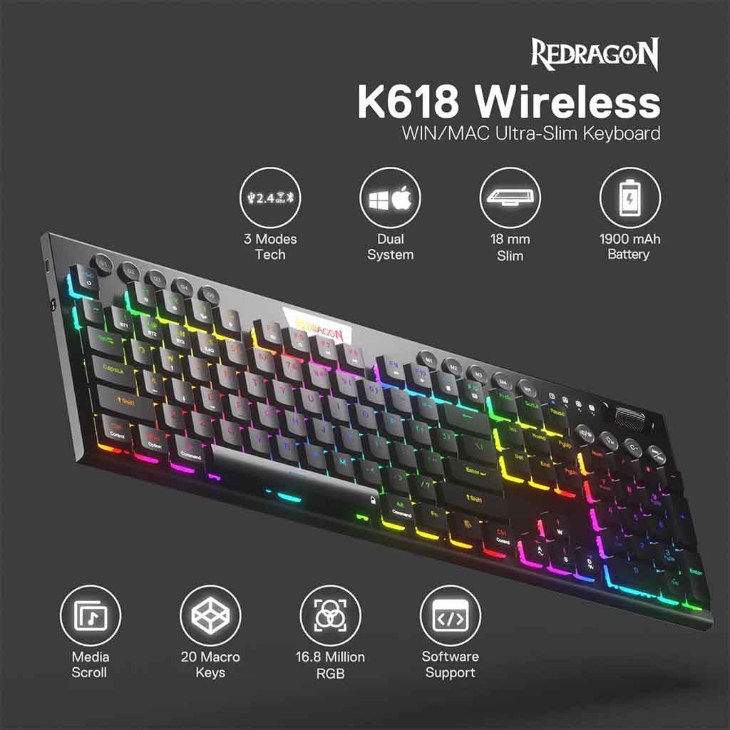 Here comes REDRAGON K618 HORUS WIRELESS RGB MECHANICAL KEYBOARD 1st-Gen 3-mode connection technology, USB-C wired, BT 3.0/5.0 & 2.4Ghz wireless modes which advanced your use experience to next level in all fields.
