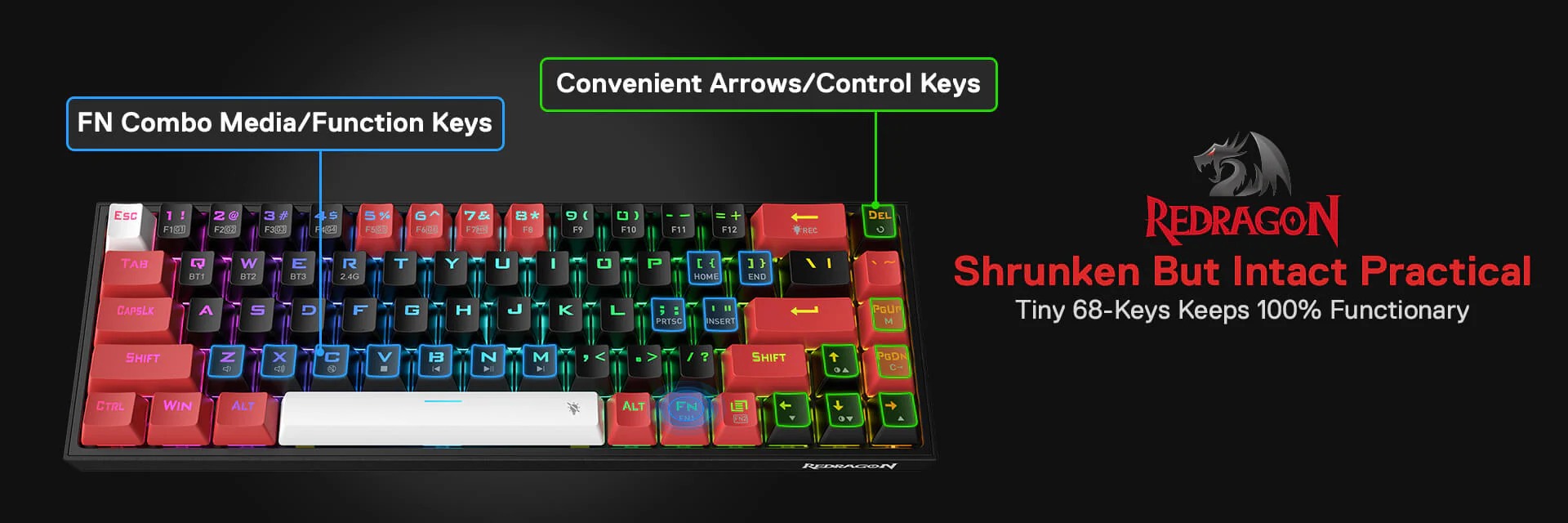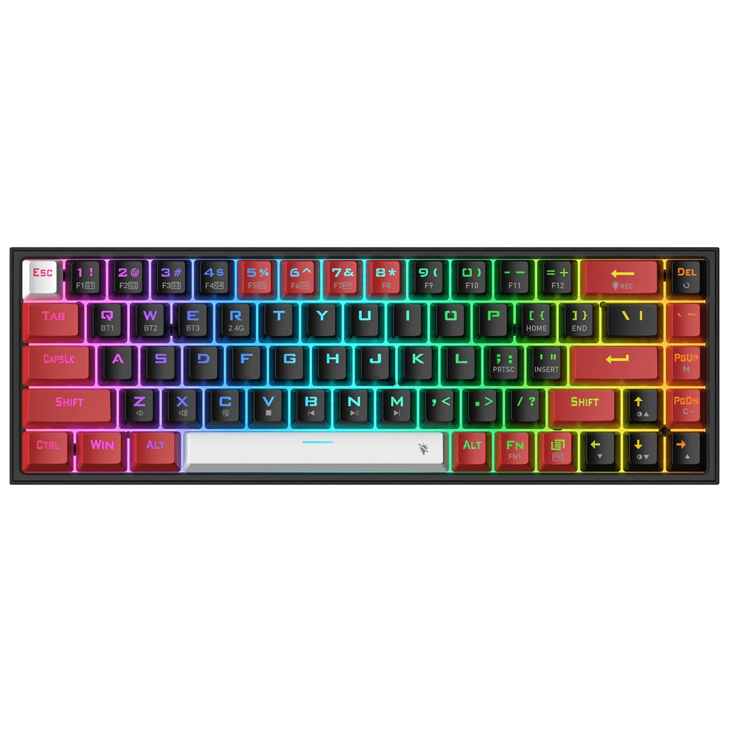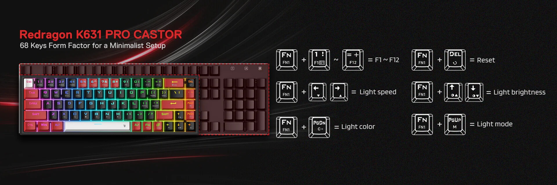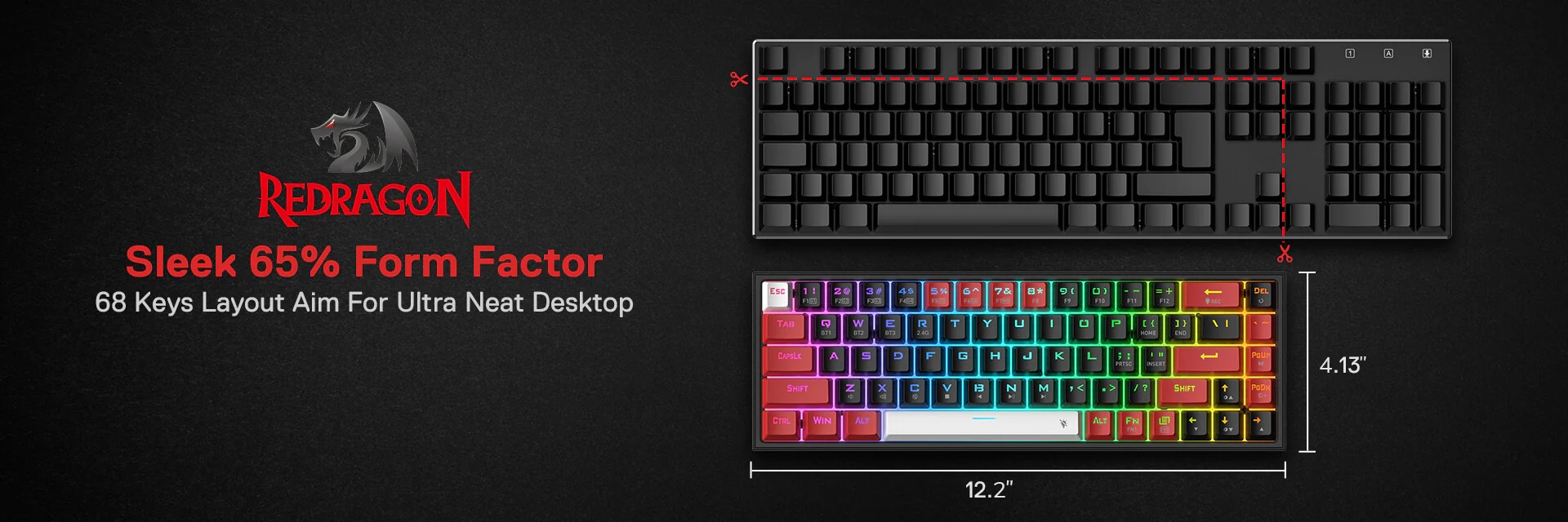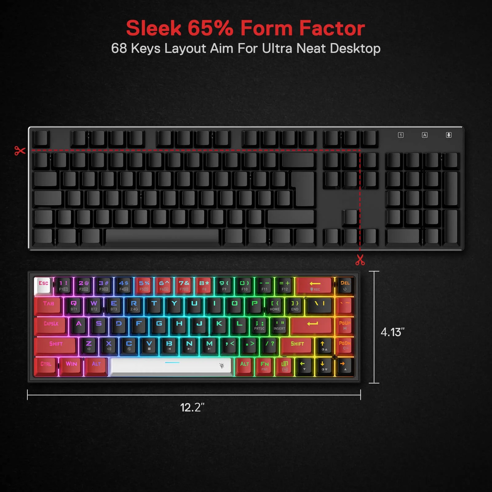 Redragon 65% layout K631 in wireless mode meets the user’s need for separate arrow keys and extra function keys. 68 keys ultra-compact and lightweight slim design frees up precious desk space for less clutter.