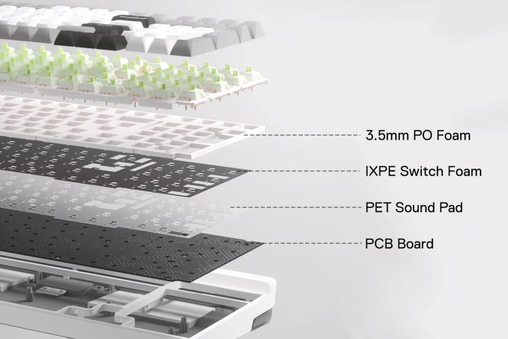 Equipped with 3.5mm PO foam, IXPE switch foam and PET sound pad. Creating dampened and ultra-clean typing acoustics, making each keystroke satisfying and audible.