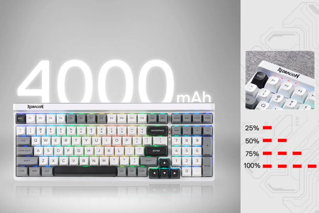 Built-in a massive 4000mAh battery for longer durability, refuse low battery anxiety and worry. Capacity is ‘transparent’ too like the keyboard, FN + F1 to check the battery level anytime.