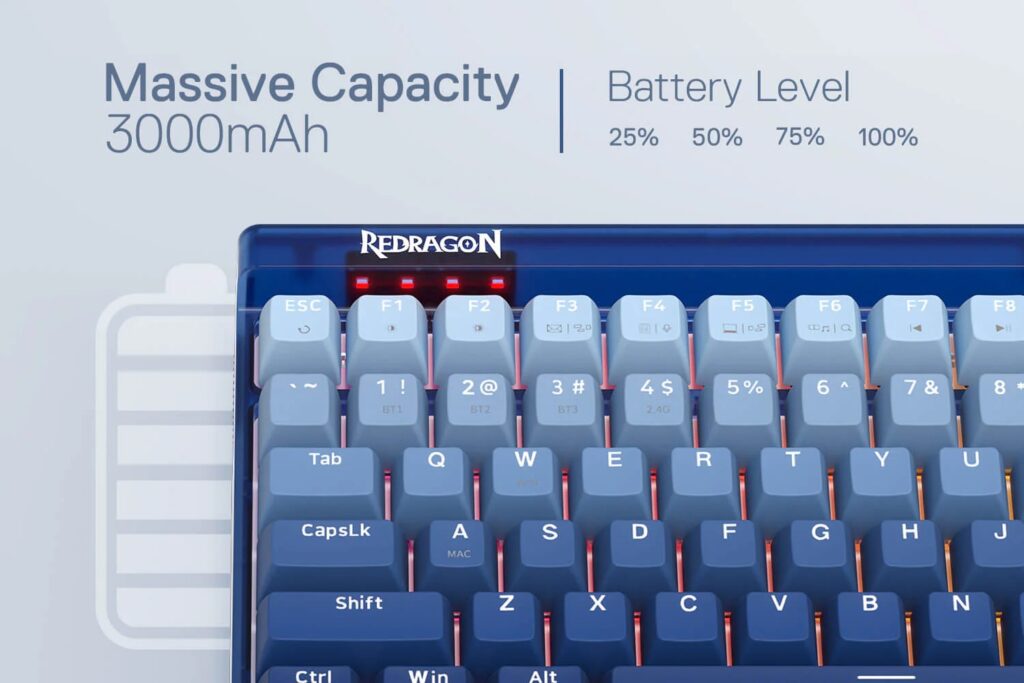 Powered by a built-in 3000mAh battery, the Redragon K656 PRO ensures you never have to worry about low battery anxiety again. You can even check the battery level anytime using the keyboard’s FN + F1 function.