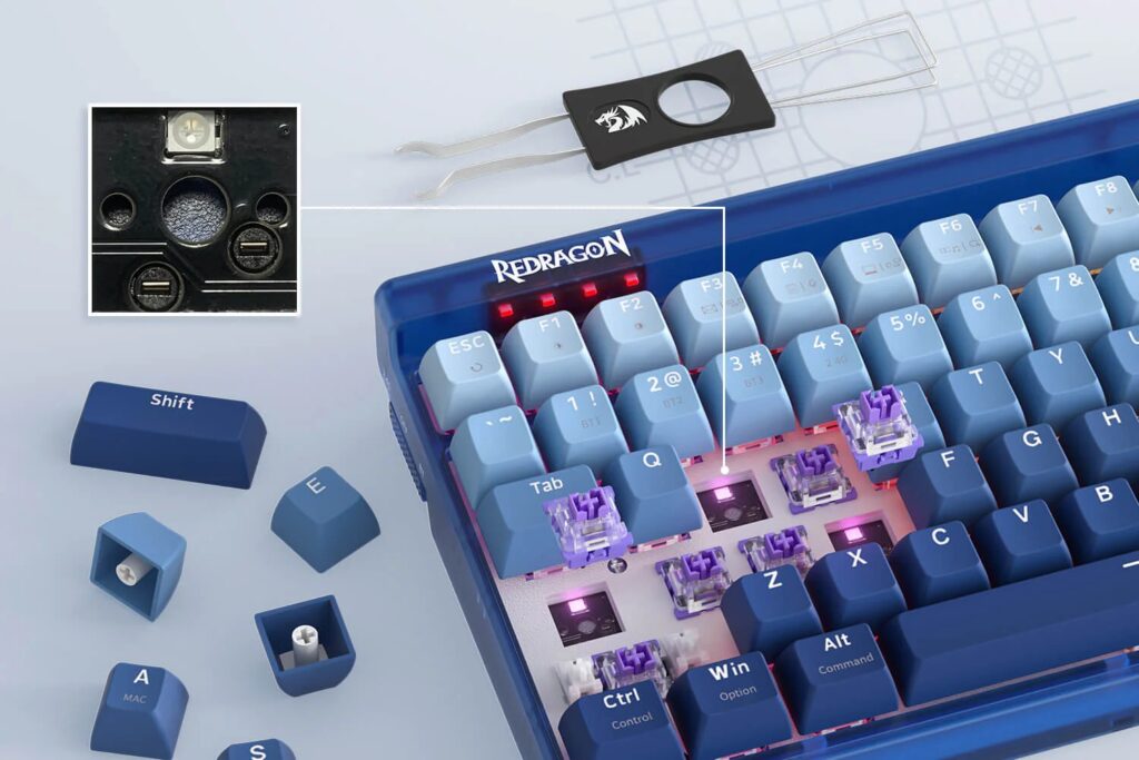 The Redragon K656 PRO features custom Purple Switches for a clear and strong tactile feel. With a satisfying ‘THOCK’ and an actuation force of 55g, these switches ensure quick and precise keystrokes, enhancing your gaming performance.