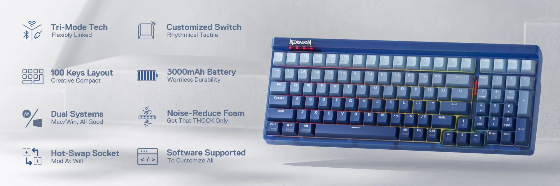 • Key Switches:    Redragon Mechanical Custom Purple Switches