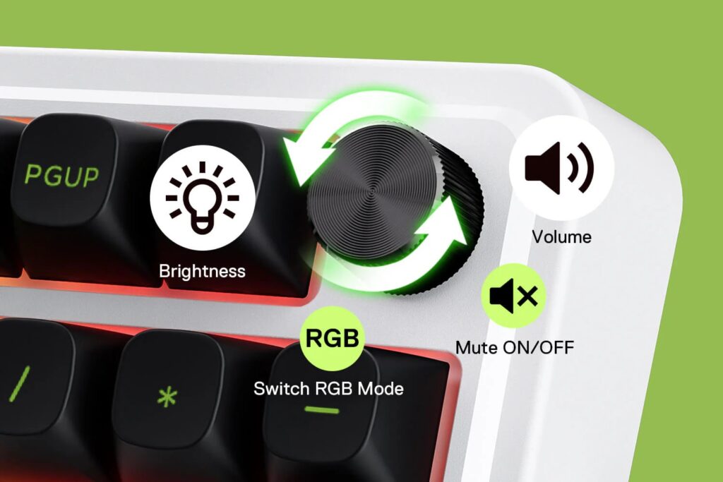 Armed with a convenient easy access control knob, the keyboard backlight brightness and media (volume, play/pause, switch) are all in control with no hassle. Plus functionary with no extra keys or space to waste.